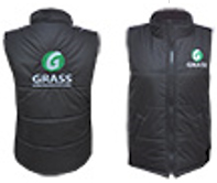 Жилет утепленный, наполнитель - синтепон. Подкладка - 100% полиэстер. Цвет черный. Воротник-стойка. Застегивается на тракторную молнию. Имеются два наружных боковых кармана и один внутренний. Вышивка произведена на левой полочке (логотипGRASS) и на спине (логотип GRASS+профессиональная автохимия).